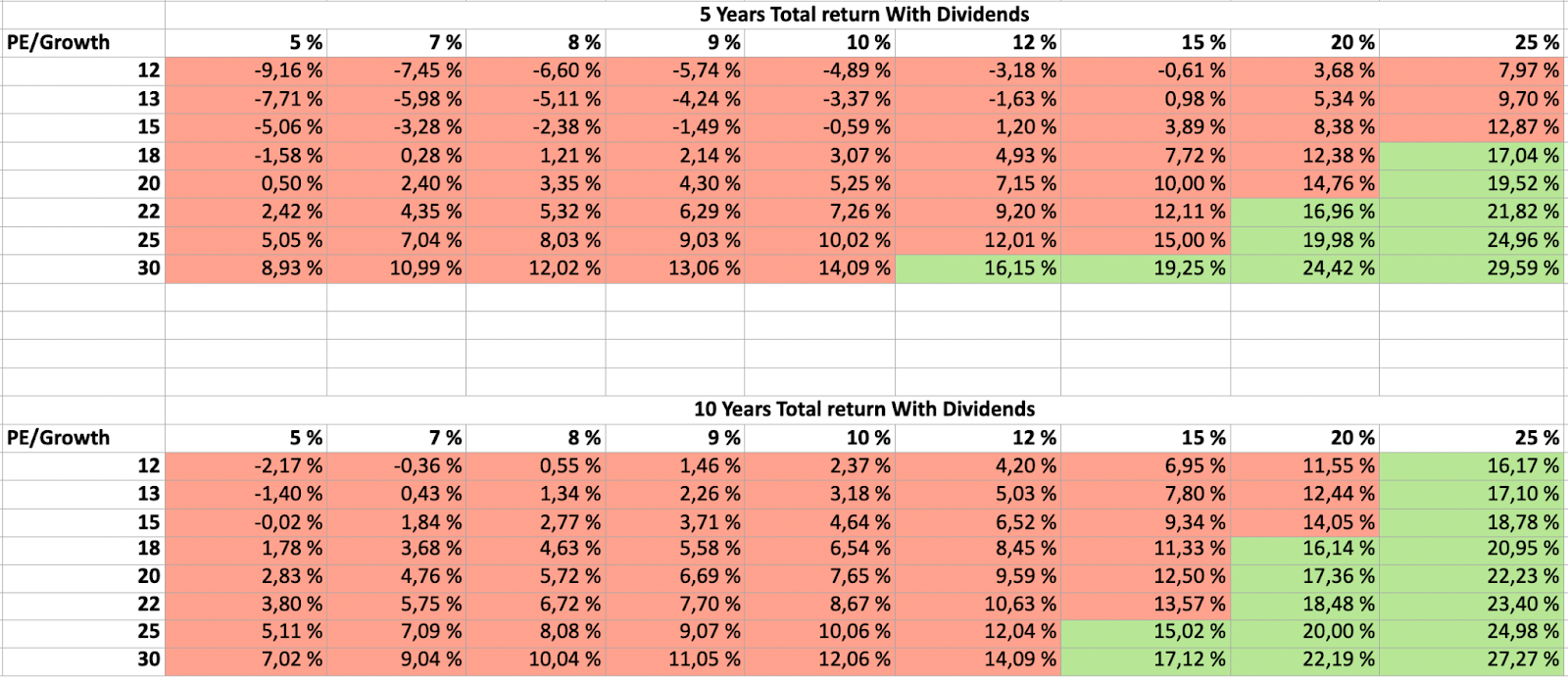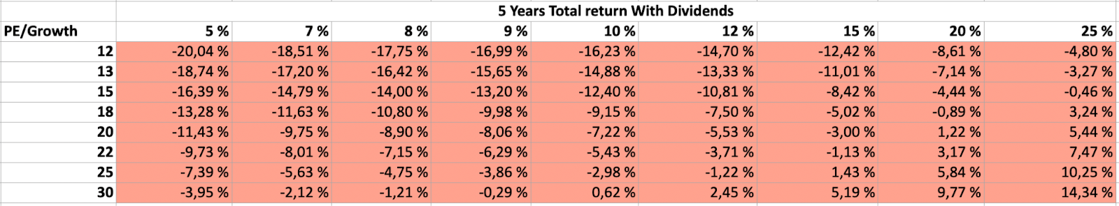 Those 3 scenarios are possible, but I personally think that the first one is the most probable because for me a company growing at 15% per year should have a PE somewhere between 20 and 25, so we’re in the high range here. We need some margin of safety.