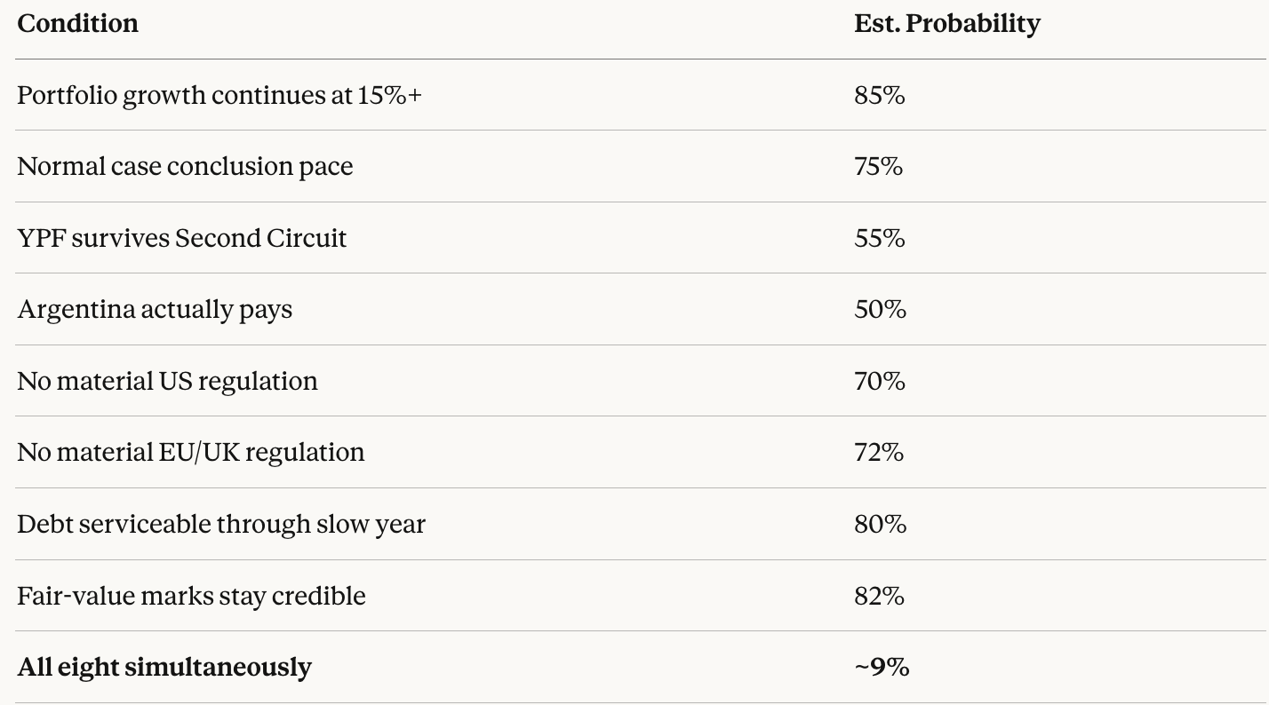 For Burford, count them: portfolio keeps growing at 15%+, case conclusions remain at a normal pace, YPF survives the Second Circuit appeal, Argentina actually pays if Burford wins, US Congress doesn’t pass restrictive legislation, EU and UK regulators don’t materially impair the TAM, debt remains serviceable through the next slow year, and fair-value marks maintain credibility with institutional investors. That’s eight conditions. Each individually plausible. Each partially outside management’s control.