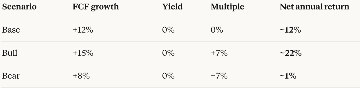 This is intentional and correct. Every dollar returned to shareholders via dividends or buybacks is a dollar not compounding at 20–25% ROIC. The only way this structure makes sense to reject is if you believe management can’t find deals at acceptable returns which is the real bear thesis, stripped down to its core.