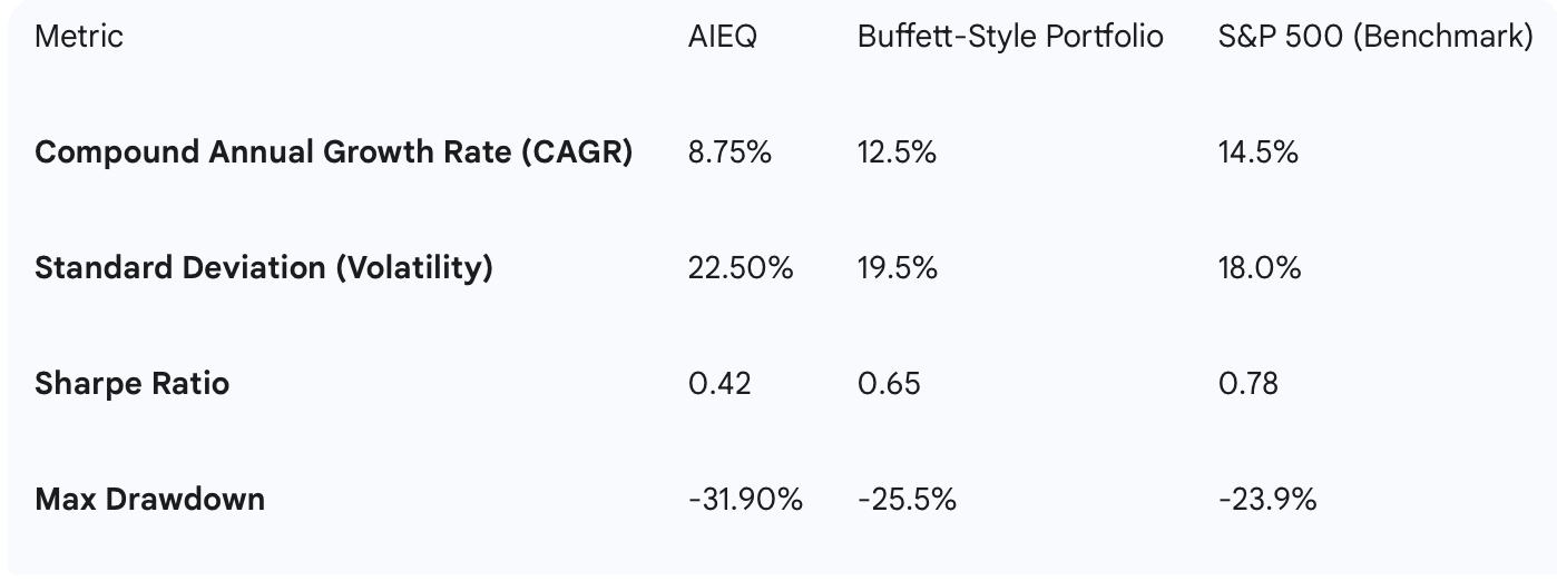 The scorecard is in. While both got beaten by the S&P 500, the Buffett-style portfolio delivered a much smoother ride. It got better returns with less drama (lower volatility), leading to a much better Sharpe Ratio. It also didn't lose as much hair during the market's panic attacks (smaller drawdown). This shows that for AIEQ, risk is a number to be tweaked daily. For Buffett, risk is the chance of a great business turning into a dud. In this round, the old-school definition of risk won.