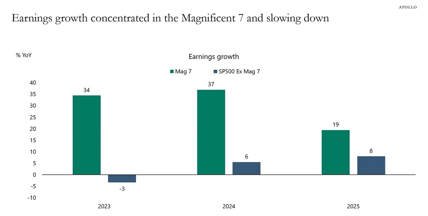 Apollo’s “High-Low Logic Index” shows that AI is simultaneously creating winners and losers—think of it as the stock market’s version of “The Hunger Games,” except instead of tributes, we have tech stocks. The Magnificent 7 have been dramatically outperforming the S&P 493 (yes, that’s what we’re calling everyone else now), which is basically the financial equivalent of LeBron James carrying the entire Lakers team on his back.