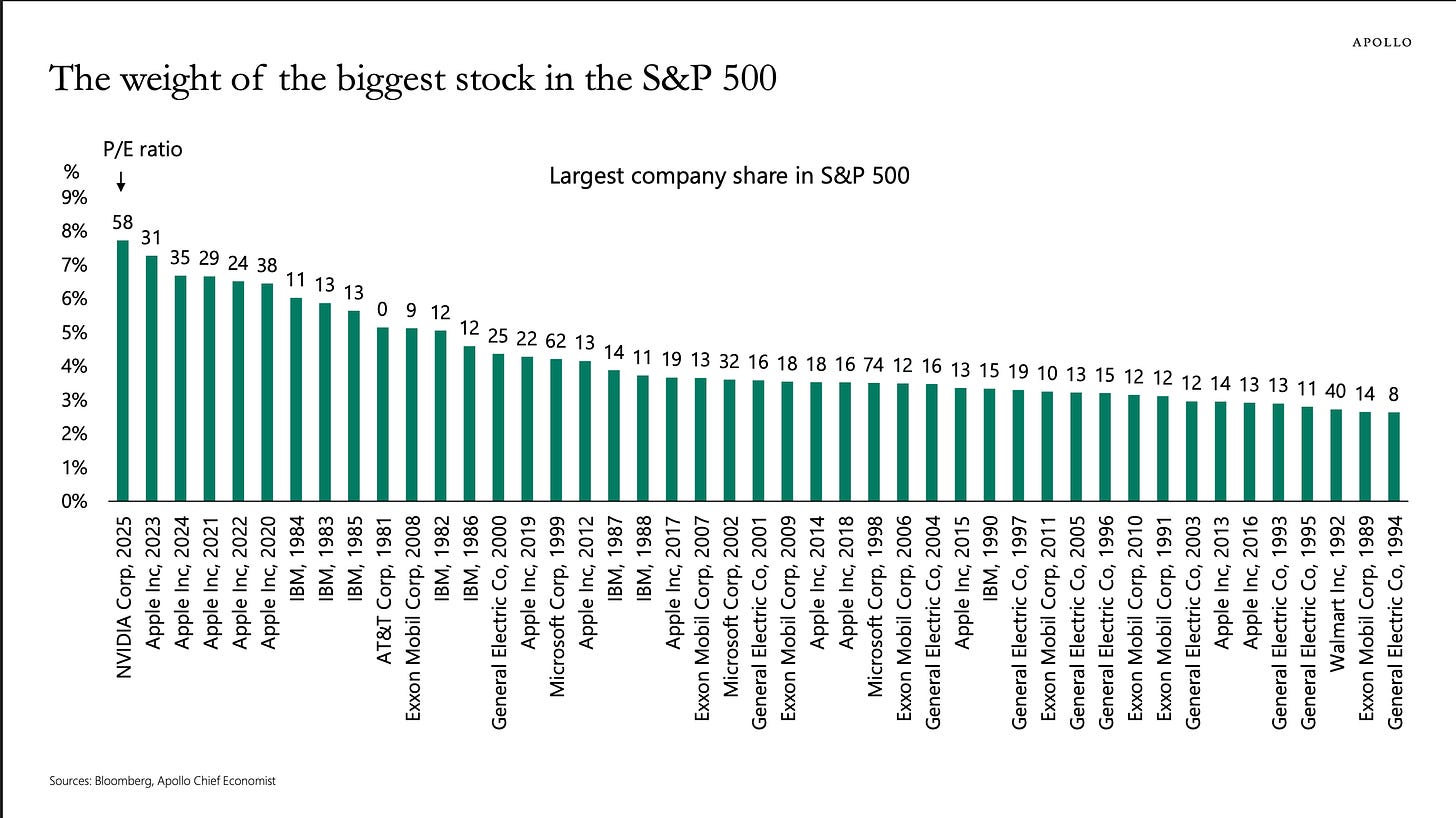 Here’s the tea, served piping hot by Apollo’s chief economist Torsten Sløk: the textbook idea that the S&P 500 gives you diversified exposure to risk is just simply no longer the case. Plot twist! Your “safe” index fund has turned into a concentrated AI bet.
