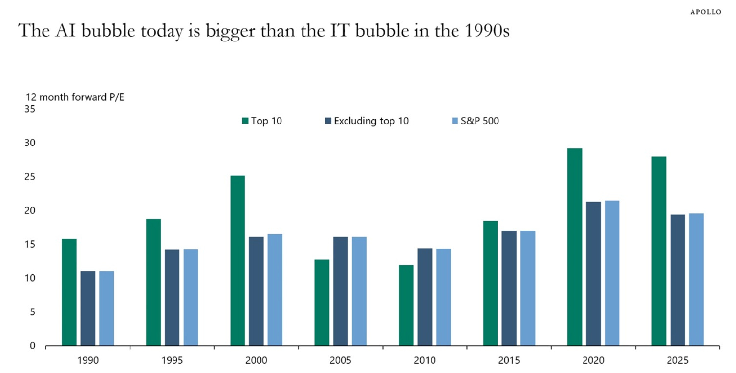 If you thought the late 1990s were wild, buckle up buttercup, because according to Apollo, the AI bubble today is bigger than the IT bubble in the 1990s. The average trailing P/E ratio of the top 10 companies is sitting pretty at around 50—that’s not a typo, that’s five-zero—compared to much more reasonable levels for the rest of the index.
